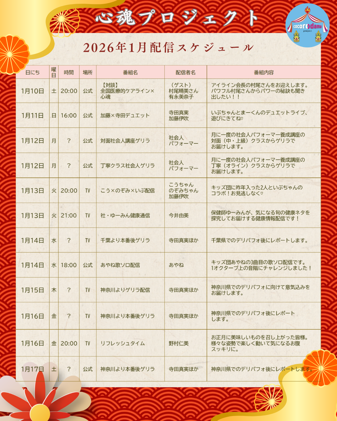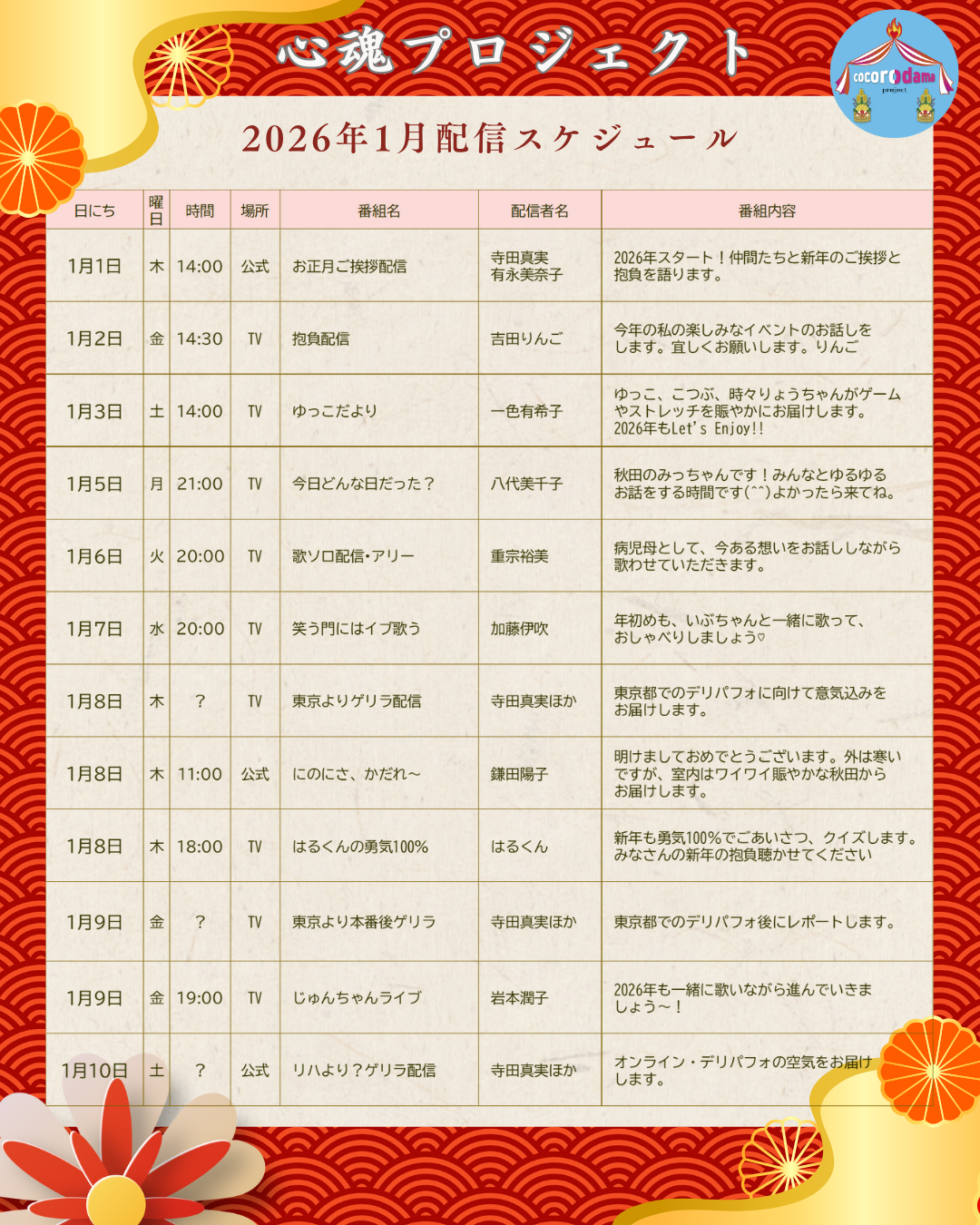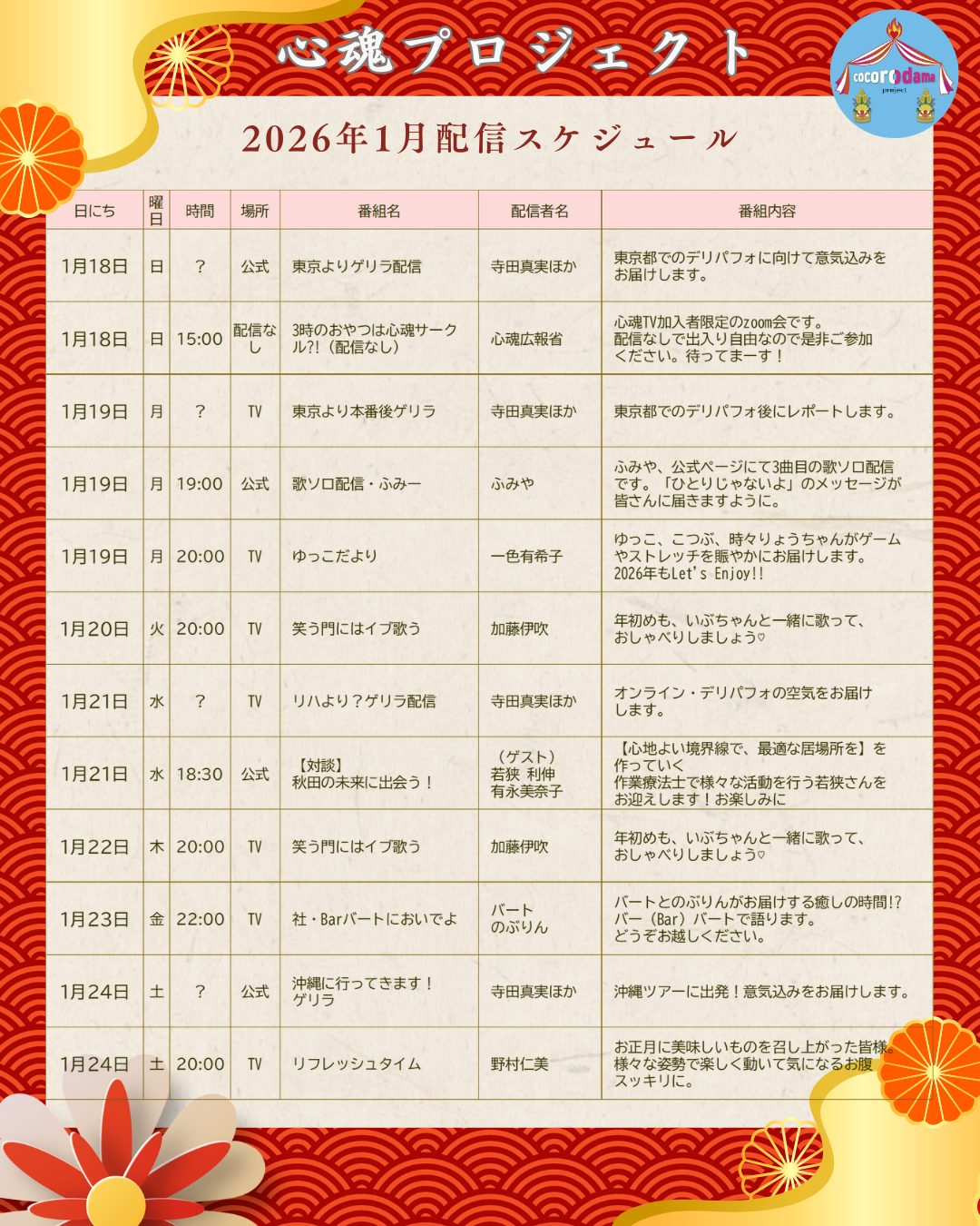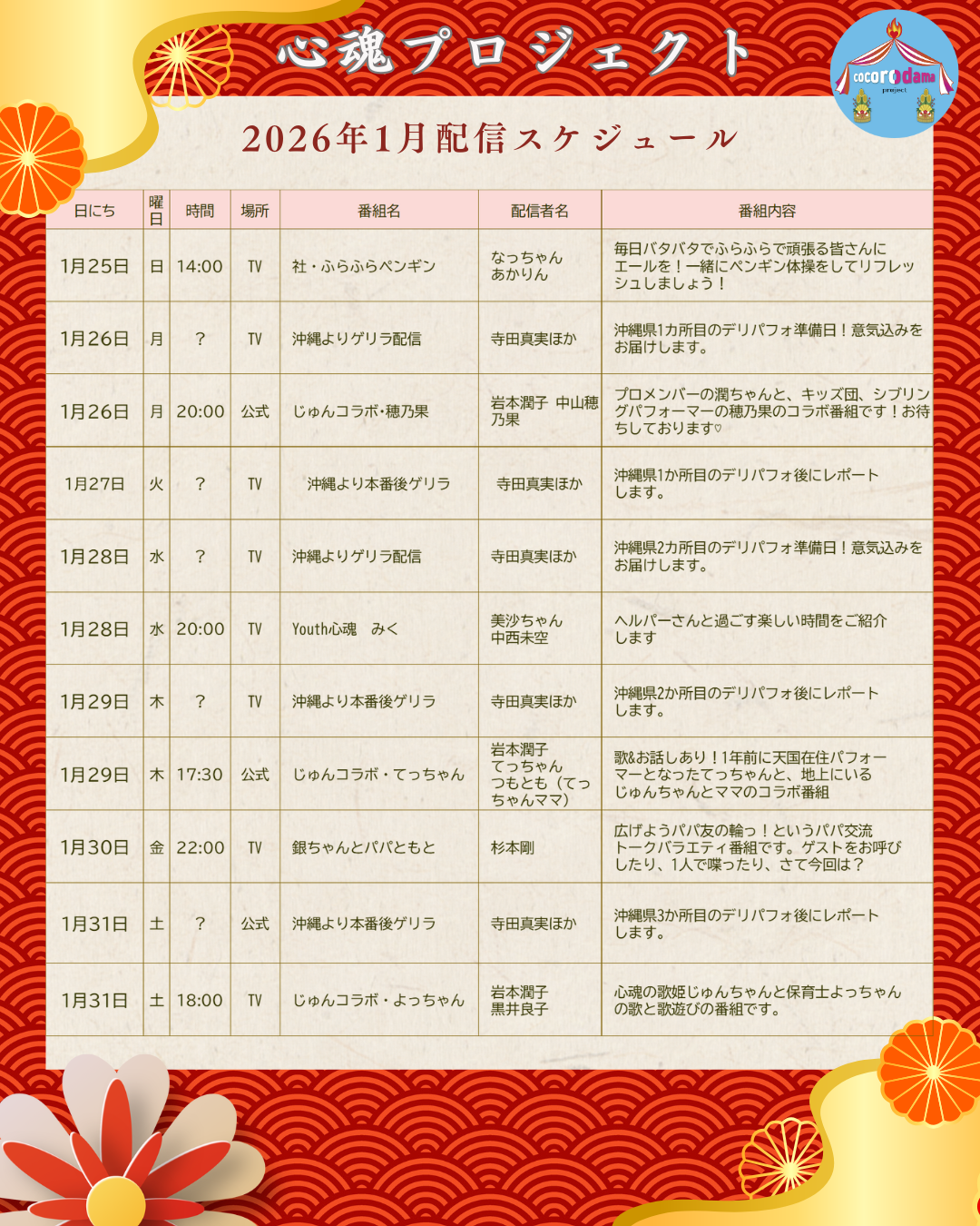 2026年1月のオンライン配信スケジュール